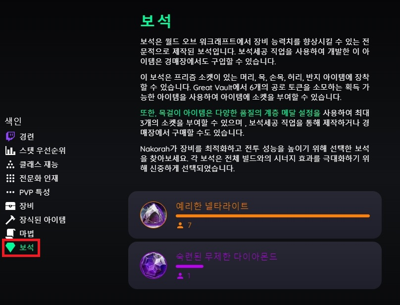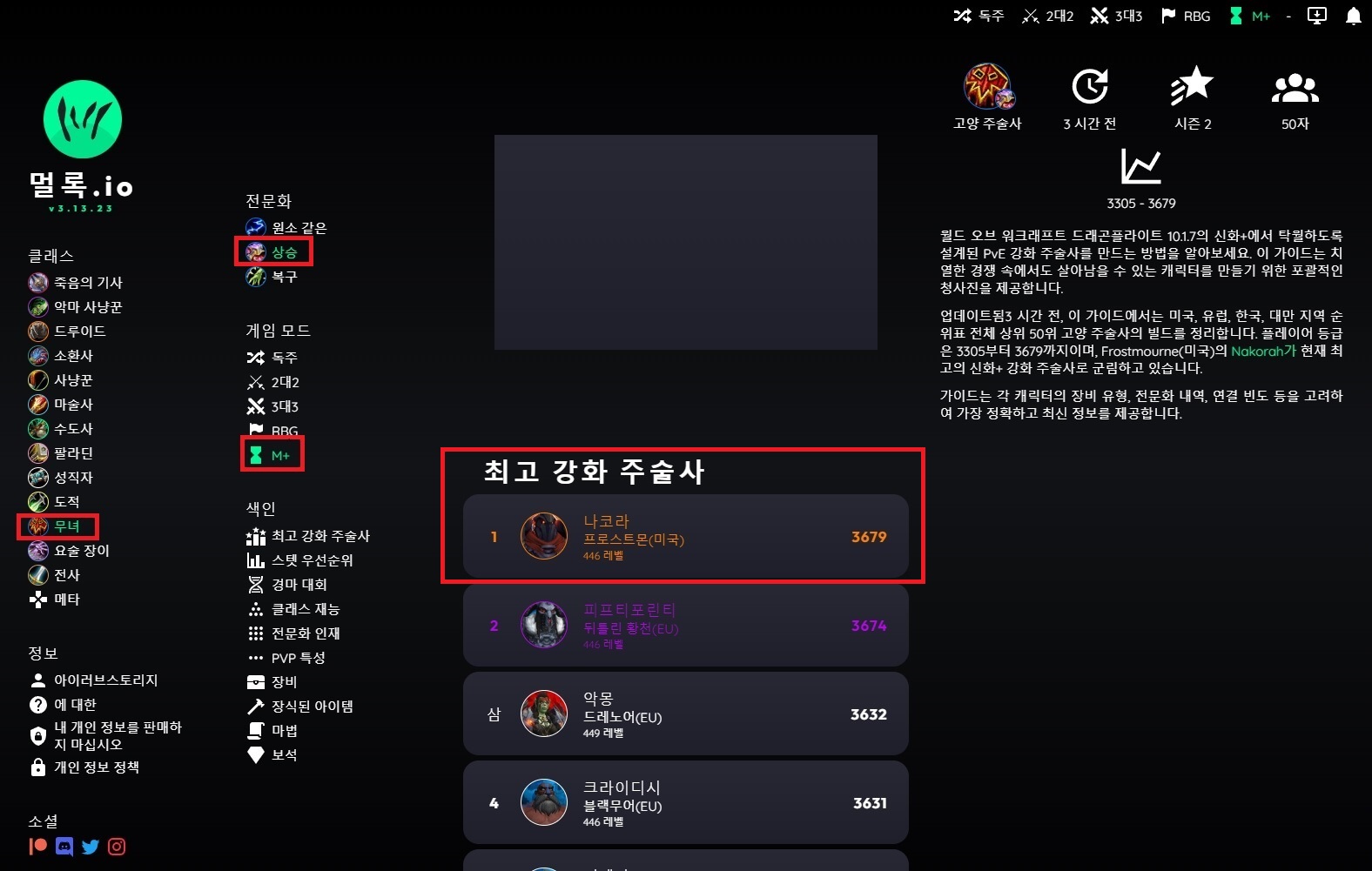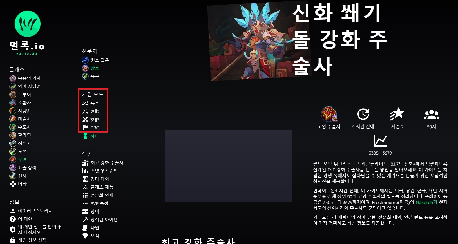 "멀록"이라는 사이트에 들어가면, 와우 직업별 랭커 50명의 PVP와 쐐기에 대한 특성, 장비, 보석, 마부, 등에 대한 정보를 보여줍니다.